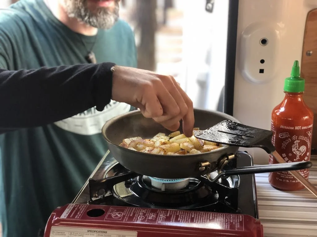 Single-burner Gas One butane cook top that is stored in a cubby near the sliding passenger door for easy access.